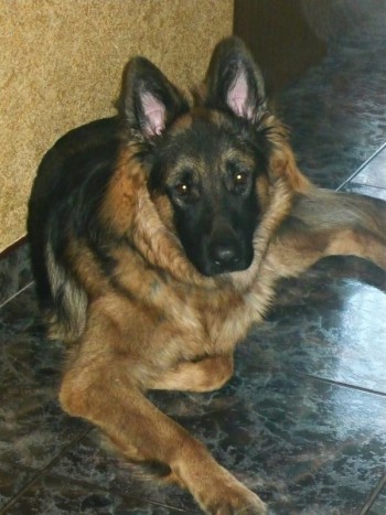 Owczarek Niemiecki długowłosy,maść czarna podpalana.Pies łagodny.Ma na sobie czarną skórzaną obrożę i szarą przeciwkleszczową