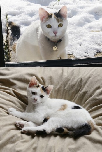 biało-trikolorowa z przewagą białego, różowa obróżka z dzwoneczkiem
