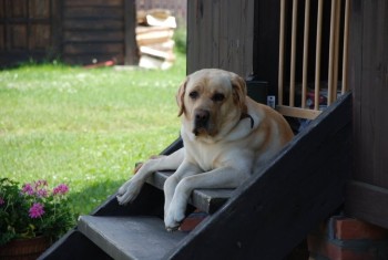 Biszkoptowy, duży, 4 letni labrador z czerwoną obrożą, tatuaż na uchu nr 027J