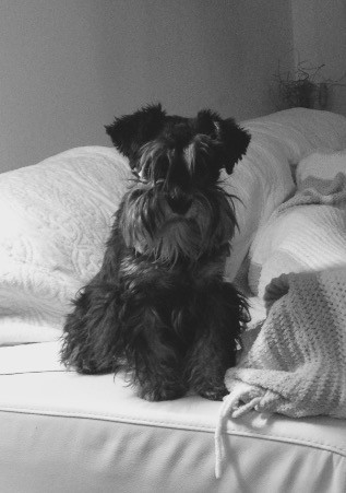 Młoda suczka, maści czarno-srebrnej, ufna, przyjaźnie nastawiona do ludzi i zwierząt. Ma wyjątkowo krótkie łapki i kitkę na końcu ogonka.
