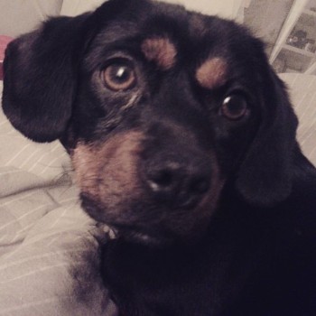 Czarna suczka w typie jamnika (krótkie nogi) z brązowymi elementami i białym krawatem. Bardzo przyjazna