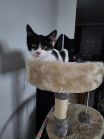 Kocurek biało czarny z obróżką na szyi.