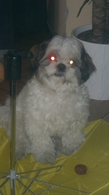 Biały z ciemnymi łatkami,na brzuchu przepuklina,w tylnych łapkach po 6 paluszków