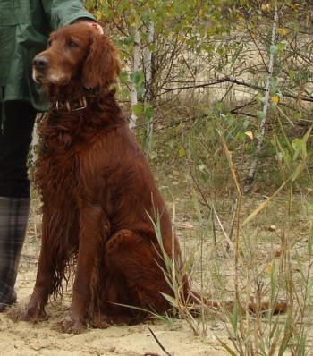 kolor mahoniowy,średniej wielkości ma obrożę.