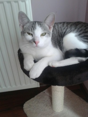 Bialo- szary kocur; okolo 3 letni; przyjaznie nastawiony do ludzi