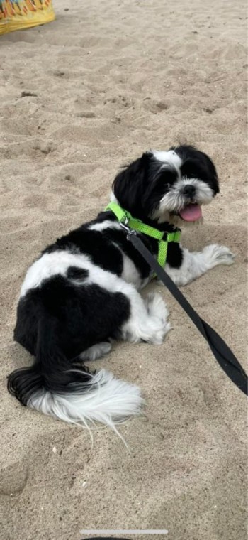 Szczeniak, nieufny, czarno biały z zielonymi szelkami, włos strzyżony