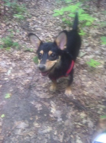 Mały, około 7 kg, czarny podpalany, charakterystyczne odstające nietoperze uszy, krzywy zgryz, krzywe łapy