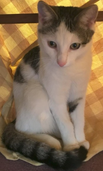 Biały kotek, kocurek roczek szczupły długie nogi. Ma łatki szare na plecach i głowie. Nosek różowy. Reaguje na swoje imię. Lubi siedzieć umywalce lub wannie. Najchętniej pije bieżącą wodę z kranu.
