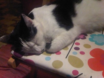 Kotka ok 5 lat, umaszczenie: biała w czarne łaty. Cecha charakterystyczna: czarna kropka nad pyszczkiem. Wabi się Kropka