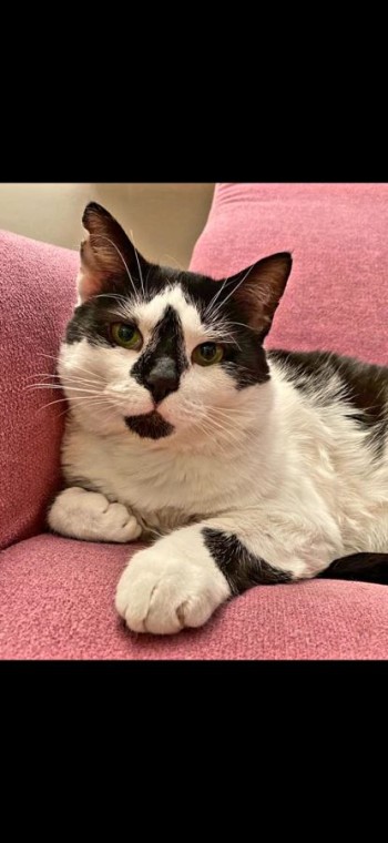 Kot o masie 5 kg 700 g. Umaszczenie symetryczne czarno-białe. Uszka czarne, prawe z małym uszczerbieniem, grzbiet czarny, ogon czarny, brzuch biały i nosek czarny.