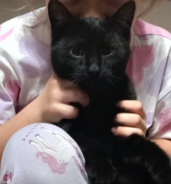 Czarny kot, pod szyją pasek białej sierści, reaguje na imię Misiek