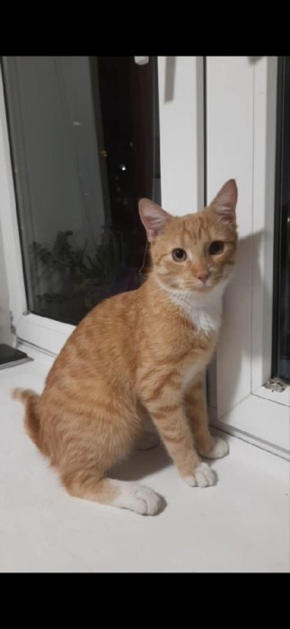 Dwuletni wysterylizowany kocur. Rudy, pręgowany, z żółtymi oczami, ma białe futerko pod brodą, białe skarpetki na łapkach i białą końcówkę ogona. Ufny i towarzyski.