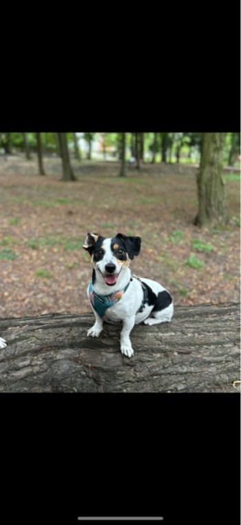 Wincent w typie Jack Russel Terrier. Brak prawego ucha. Ma na sobie różowo - niebieskie szelki.