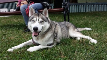Duży, srebrne umaszczenie, biało-niebieskie oczy, ciemna oprawa oczu, brązowo -beżowe szelki.
