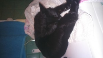 Czarny kocur z białym krawatem. Reaguje na imię Urwis