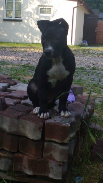 Suczka w typie pitbull łagodna i bardzo bżyjazna , ma plamkę na nosie i biały krawat