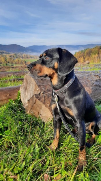 mieszaniec w typie gończy, czarny podpalany, średniej wielkości waży ok.15 kg ma 8 lat, mordka lekko posiwiała