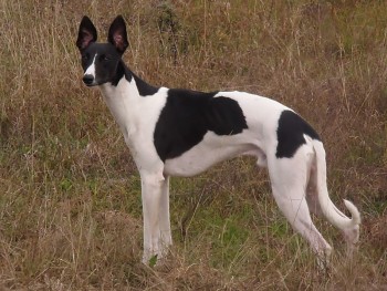 Pies, samiec biały w czarne łaty. Sierść krótka.Waga 15 kg. wys. w kłębie 51 cm.Budowa typowa dla charta. Łagodny