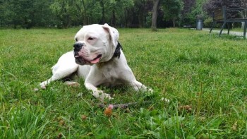 Biały bokser, 5 lat, brązowa, skórzana obroża.