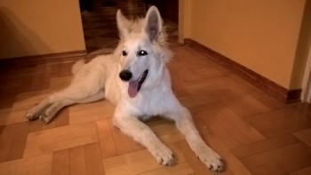 Biały, duży, 8 miesięczny owczarek, miał niebieską obrożę oraz tatuaż na brzuchu o numerze 142K