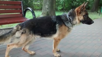 Owczarek niemiecki, krótkowłosy, czarny podpalany, suczka, ze srebrną kolczatką na szyji.