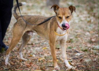 Pies ma czerwoną obrożę. Bardzo aktywny, jednakże niegroźny - bardzo przyjacielski.