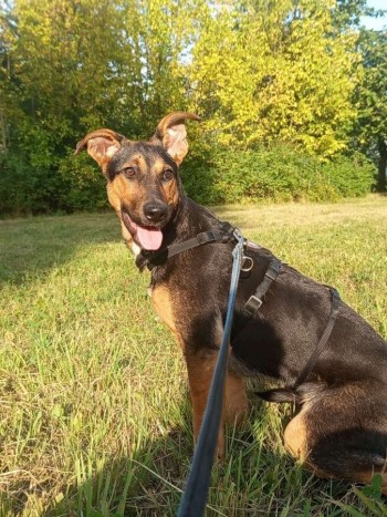 Gouda - szczupła, czarna podpalana z białymi akcentami (krawat), lekko oklapnięte uszy. Wysunęła się z szelek podczas spaceru, miała na sobie obrożę, ale możliwe, że ją ściągnęła. Młoda (ok. 6 miesięcy), nieufna, raczej nie podejdzie do obcej osoby. Prosimy zawiadomić Przytulisko w Głownie lub opiekunkę 574 186 362