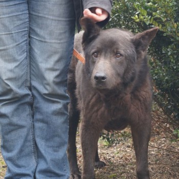 Pies w typie owczarka, brązowo czarna sierść, starszy, z bardzo krótkim ogonkiem (ogon ucienty)