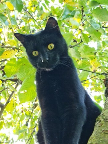Cały czarny, kastrowany kocurek. Pojedyncze białe włoski w uchu. Raczej nieufny do obcych ludzi.