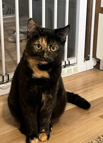 Kotka o czarno-rudym (szylkretowym) umaszczeniu, z wyraźną rudą plamką na pyszczku i rudymi końcówkami łapek.