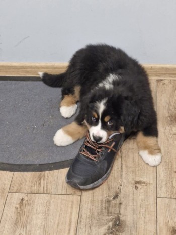 szczeniak to bernenski pies pasterski, bardzo żywy i ciekawski