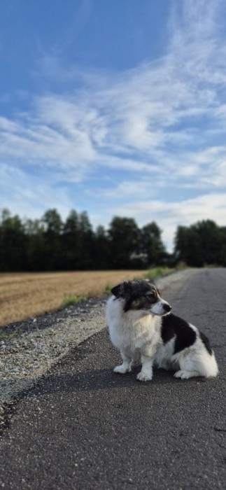 Mały pies w typie corgi, biało czarny bez ogonka
