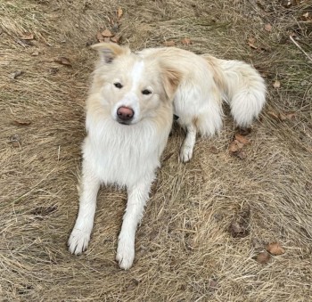 Border collie ee red, kolor Biało-biszkoptowy, na szyi miał czerwoną obrożę.
