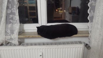 raczej nie zbliża sie do obcych ludzi, jest grubaśny, ma biały krawacik, kilka źdzbeł białej sierści
