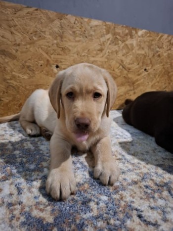 biszkoptowy labrador spokojny z obroża Supermana