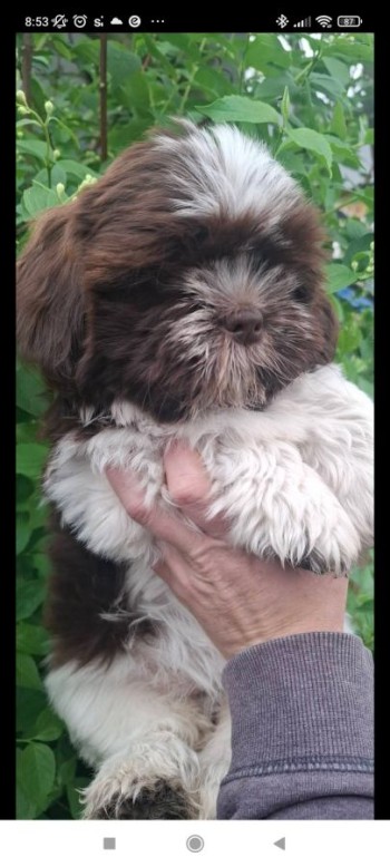 Kolor czekoladowo biały, pies miał na sobie szelki