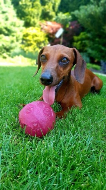 Jamnik krótkowłosy rudy, bardzo mała, kocha piłki. Zachipowana oraz ma tatuaż w uchu