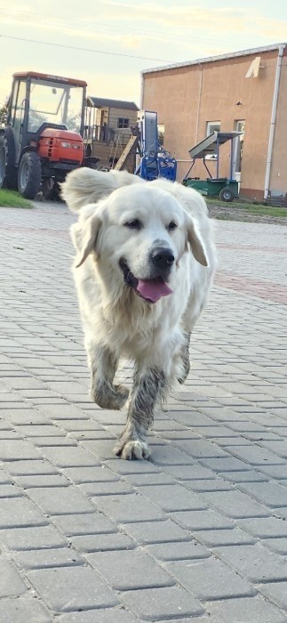 pies łagodny z niebieską obroża