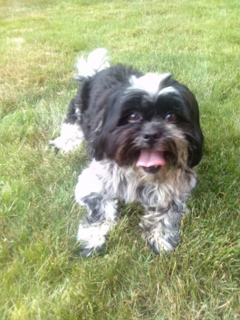 Pies w typie rasy Shh-tzu, 16 lat. Nieduży, waga ok. 9 kg. Umaszczenie czarno-białe z białą strzałką na głowie. Nogi krótkie. Czerwona obroża na szyi.