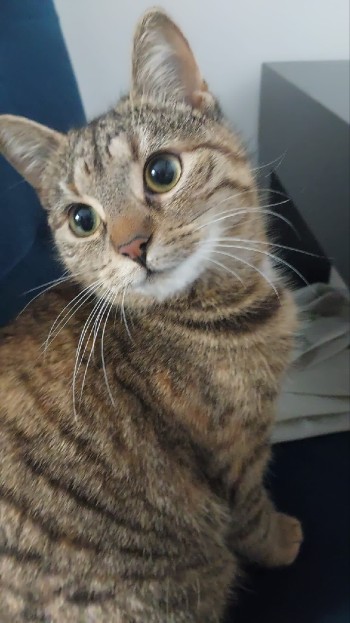 Młoda kotka, bura, pręgowana ciemno brązowa, biała broda, na szyji biała plamka