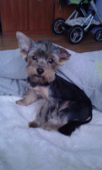 Piesek york wabi się Tofik miał na sobie czerwony puszorek ze serduszkiem. Miał trochę dłuższą sierść niż na zdjęciu.