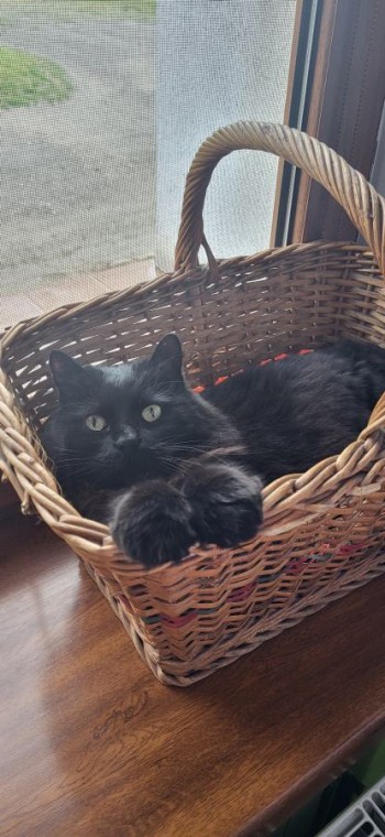 Kot średnio włosy czarny z brązowymi odcieniami. Wykastrowany z czerwoną obrożą. Nieufny do obcych.