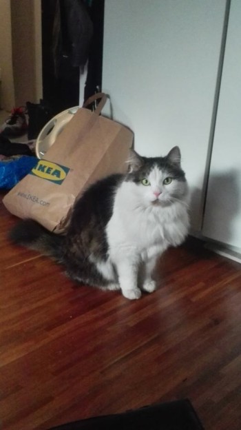 Kot długowłosy w typie kota norweskiego. Około 5 lat, gruby, biało-szary z plamami rudymi na pyszczku. Różowy nos.