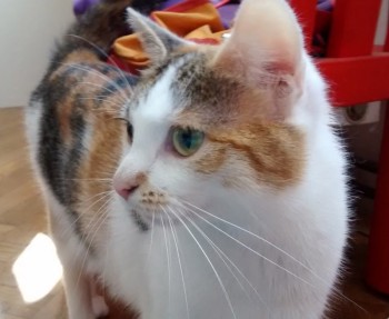 drobna kotka maści tricolor. Wabi się Pętelka, jest bardzo płochliwa. Choruje na lewe oczko.