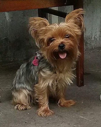 York samica czarna podpalana, ścięte włosy na krótko, obroża zielono-żółta jaskrawa.