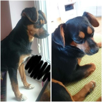 Maly dwu - trzy letni piesek. Czarne umaszczenie z brązowymi elementami. Wabi się Tobi. Strachliwy, ale reaguje na swoje imię.