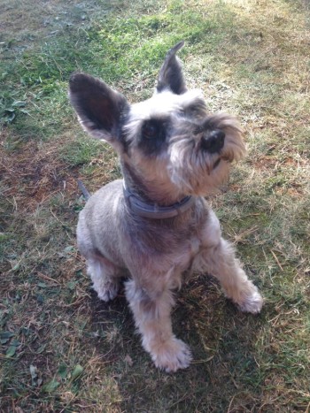 Sznaucer miniaturowy - sunia Sonia. Kolor: sól i pieprz, ma białą kropkę na nosku.