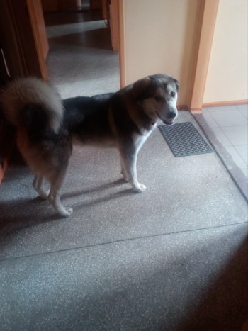 Pies Moris mieszaniec husky z kaukazem sierść długa szaro-czarna-biała.