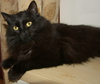 Czarna, puchata, z brązowym połyskiem, długowłosa kotka. Ma 6 lat, jest drobna, waży ok. 2 kg, wysterylizowana. Reaguje na imię Sadza