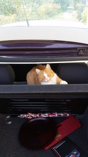 Rudy kot, biały brzuch z rudą łatką, biały krawat zielone oczy.
